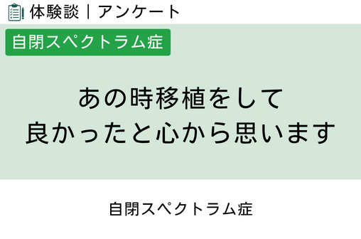 自閉スペクトラム症のお子さんのご家族の方に、患者さんの声をいただきました。 「息子は移植してから、理…